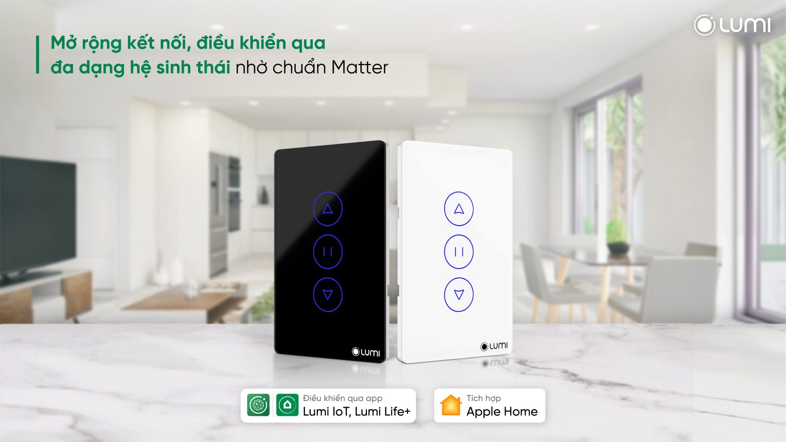 Nhờ tích hợp chuẩn Matter – giao thức truyền thông hiện đại bậc nhất trong nhà thông minh, công tắc cửa cuốn thông minh Lumi có thể dễ dàng kết nối với nhiều hệ sinh thái sản phẩm thông minh như Apple Home, đem lại trải nghiệm sử dụng liền mạch. Cũng nhờ đó, người dùng có thêm lựa chọn điều khiển cửa cuốn bằng giọng nói khi sử dụng thêm loa thông minh có tích hợp Matter.